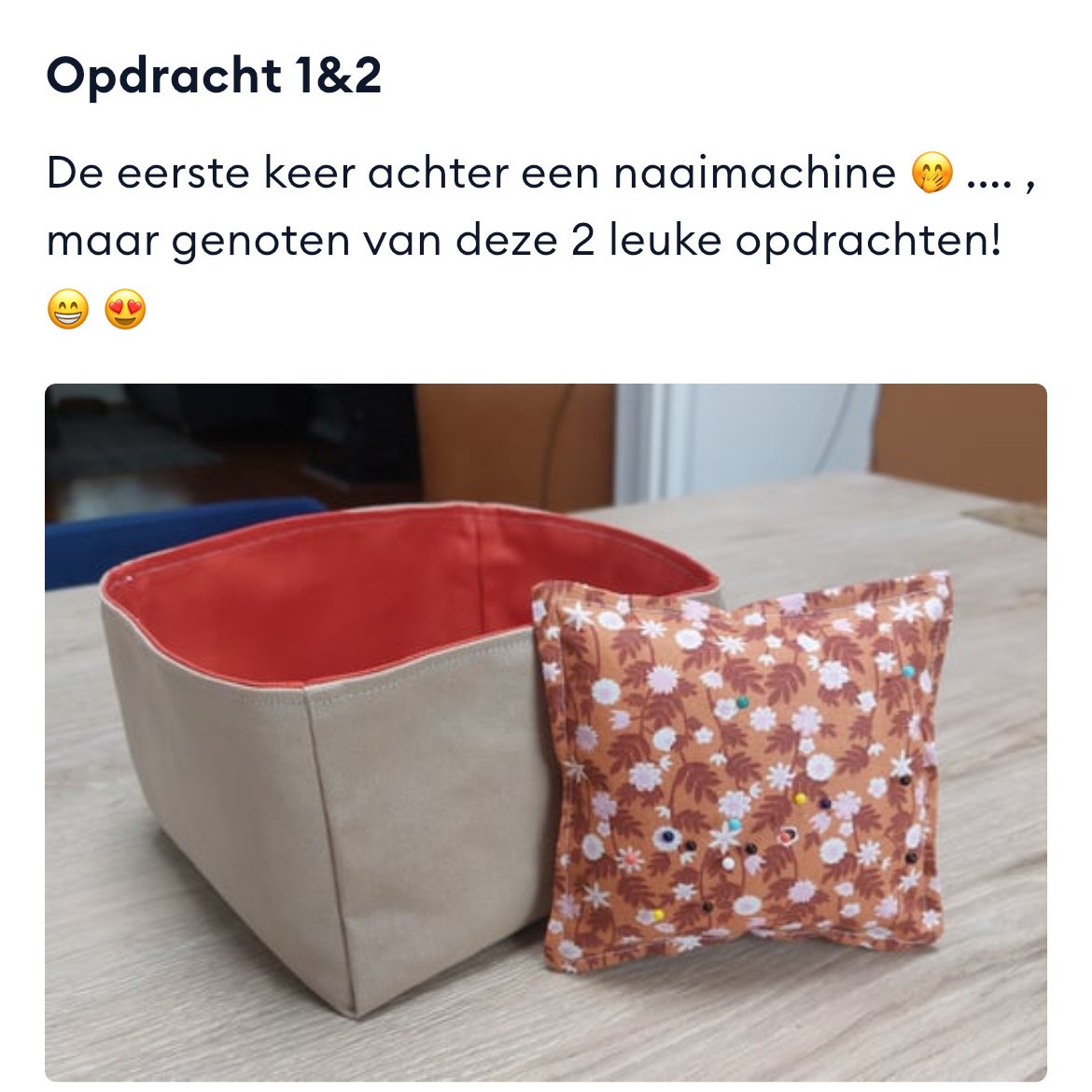 Je maakt eerst vooral accessoires en handige spullen voor je naaiplek. Via de bonus modules leer je ook je eerste kledingstuk naaien, en bijvoorbeeld ook patchwork technieken.